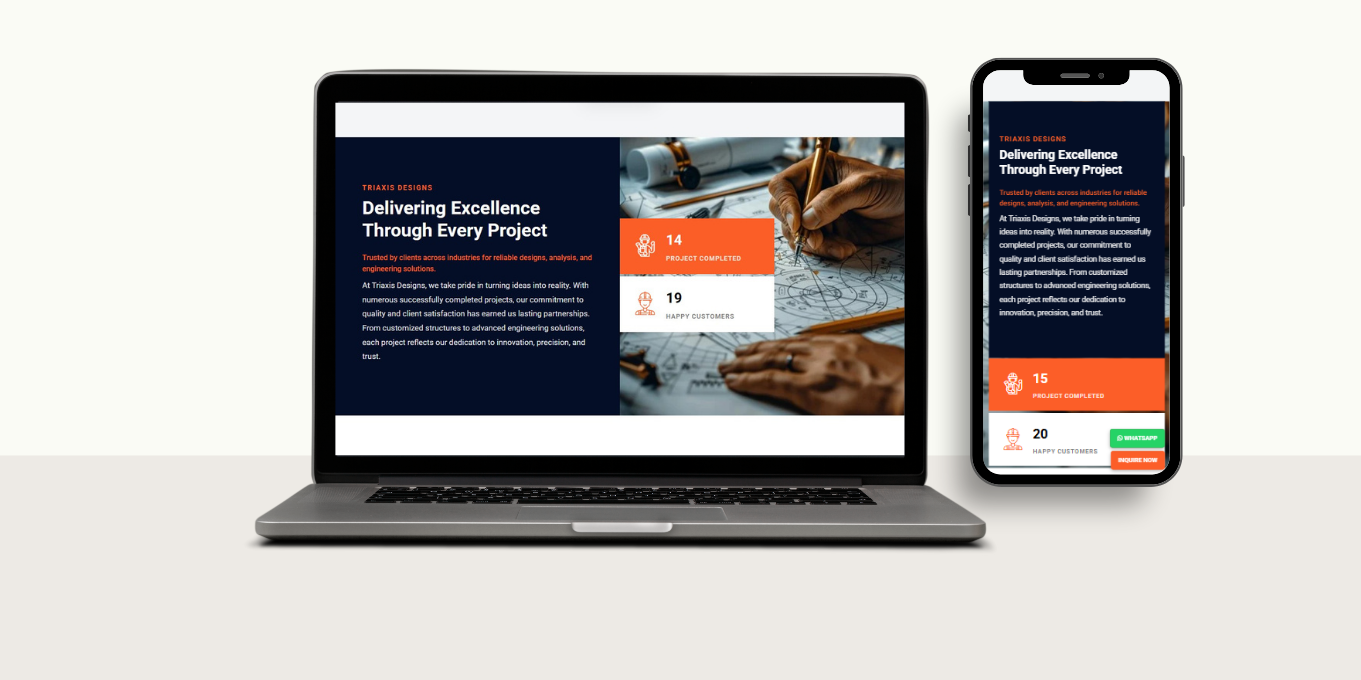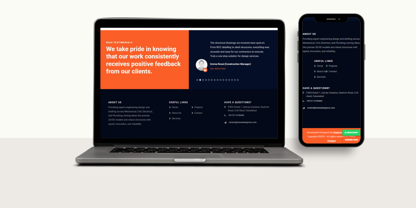 Deeplink Technologies designed and developed the complete website for Triaxis Designs, a multidisciplinary engineering firm offering expert Mechanical, Civil, Electrical, and Plumbing (MEP) design and drafting services. The platform showcases Triaxis Designs’ ability to turn ideas into precise 2D/3D models and robust structures with speed, innovation, and reliability. Built with a focus on performance, usability, and modern aesthetics, the website provides an engaging way for clients to explore services and connect for technical collaborations.